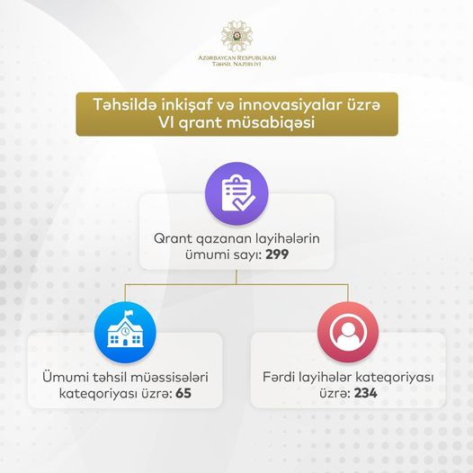 Azərbaycan Respublikası Prezidentinin sərəncamı ilə təsis edilən və hər il keçirilən təhsildə inkişaf və innovasiyalar üzrə qrant müsabiqəsinin builki nəticələri açıqlanıb. Müsabiqəyə ümumilikdə 1101 layihə təqdim edilib ki, bu da ötən illə müqayisədə 130 layihə çoxdur. Daxil olan layihələrin 256-sı ümumi təhsil müəssisələrinin, 845-i təhsilverənlərin fərdi layihələri olub.