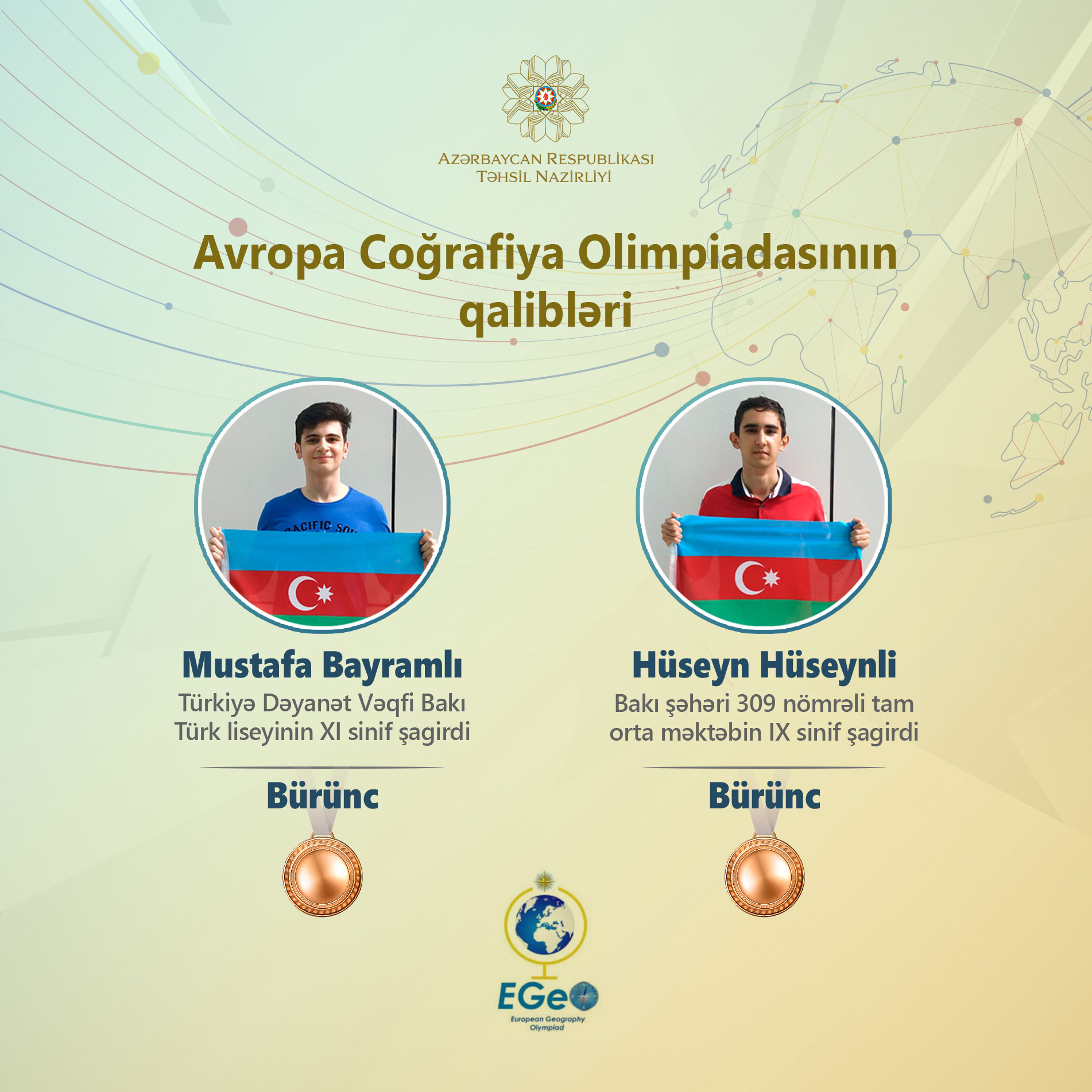 Belə ki, aşağı və yuxarı yaş qrupu üzrə 14 ölkədən 73 şagirdin qatıldığı müsabiqədə Türkiyə Dəyanət Vəqfi Bakı Türk liseyinin XI sinif şagirdi Mustafa Bayramlı və Bakı şəhəri 309 nömrəli tam orta məktəbin IX sinif şagirdi Hüseyn Hüseynli bürünc medala layiq görülüblər.